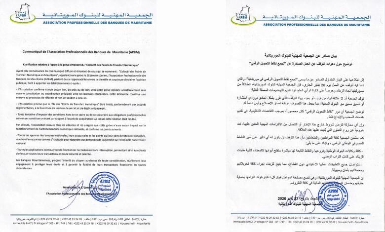 الجمعية المهنية لبنوك موريتانيا .. تنفي علاقتها بدعوة الإضراب وتطمئن المواطنين بشأن الخدمات الرقمية