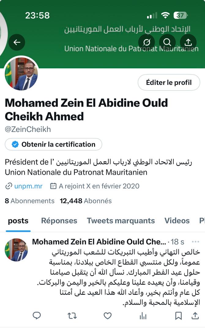 رئيس أرباب العمل يهنئ الشعب الموريتاني والقطاع الخاص بمناسبة عيد الفطر