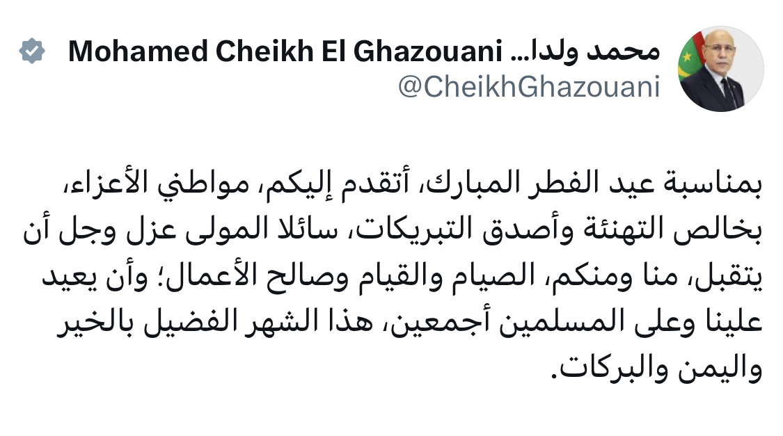 هنّأ الرئيس الموريتاني، محمد ولد الشيخ الغزواني، المواطنين بمناسبة عيد الفطر المبارك، وذلك عبر تغريدة نشرها على حسابه الرسمي بموقع “إكس” (تويتر سابقًا).