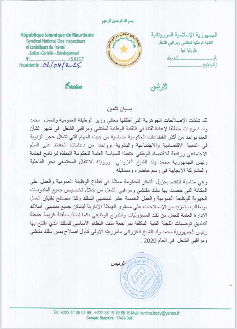 أشادت النقابة الوطنية لمفتشي ومراقبي الشغل بالإصلاحات الجوهرية التي أعلنتها الحكومة الموريتانية مؤخرًا، وخاصة وزارة الوظيفة العمومية والعمل ممثلة في الوزير محمد ولد اسويدات والتي وصفتها بأنها خطوة إيجابية نحو تعزيز كفاءة القطاع وتحسين ظروف العمل.