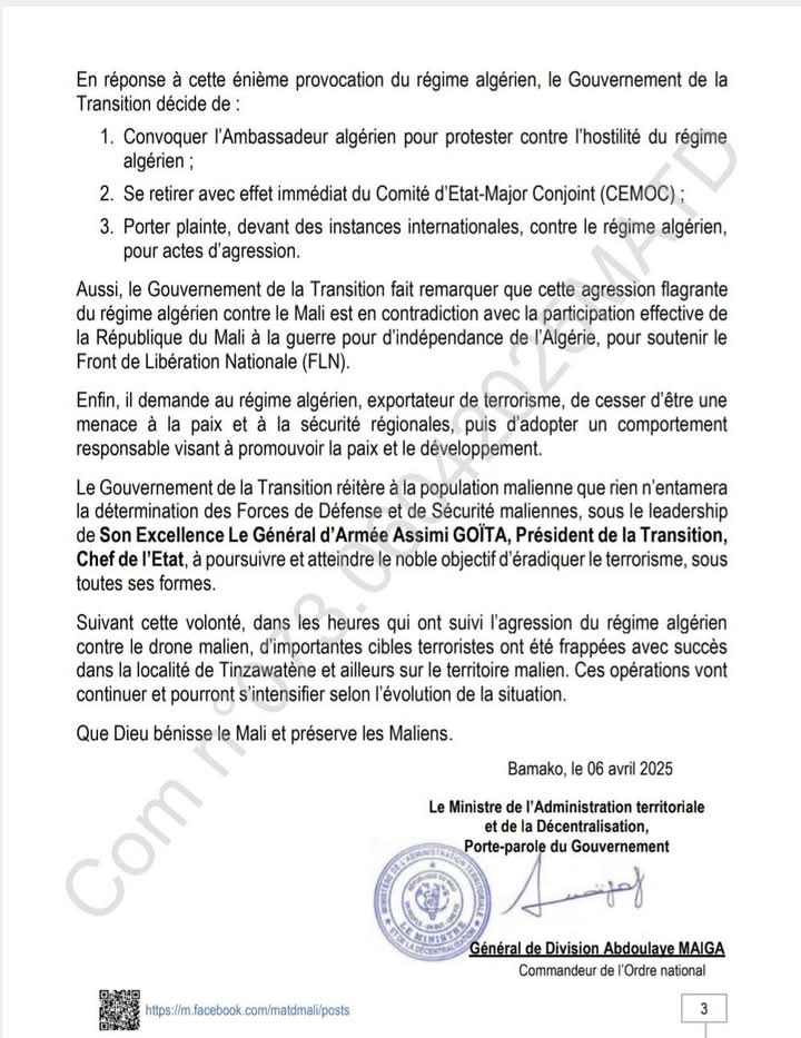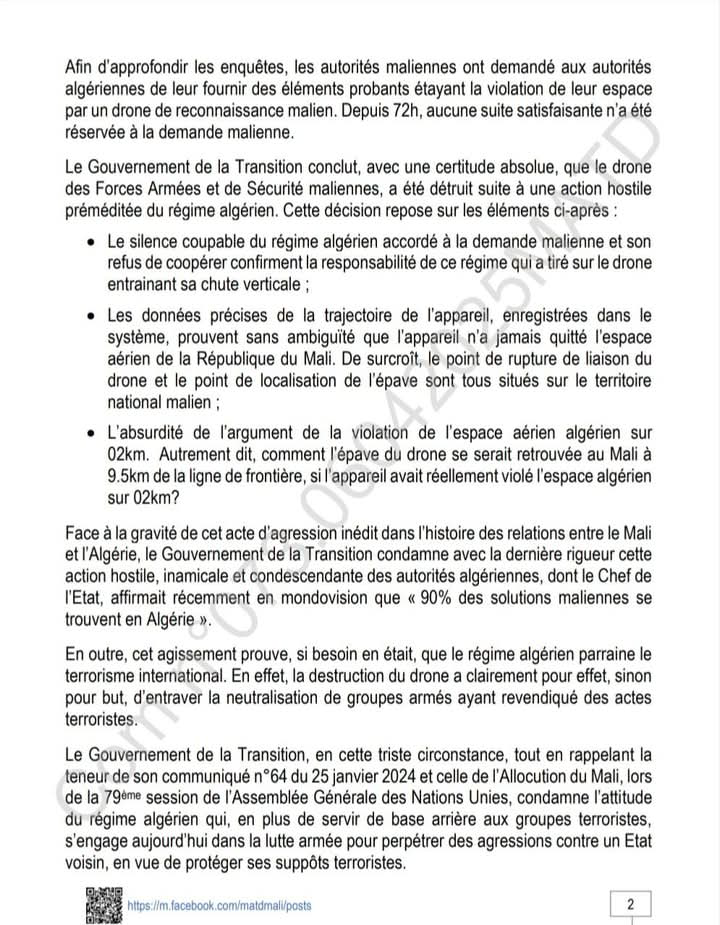 وبعد نحو ساعتين على صدور البيان الجزائري، أعلن الجيش المالي تحطم طائرة مسيَّرة تابعة له ليل 31 مارس 1 ابريل في “منطقة غير مأهولة” في تين زاوتين بولاية كيدال “دون وقوع أضرار بشرية أو مادية على الأرض”.