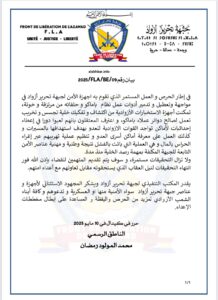 أعلنت جبهة تحرير أزواد عن تفكيك خلية تجسس وتخريب، زعمت أنها تعمل لصالح “دوائر عملاء باماكو”. وأوضحت الجبهة في بيان صادر عنها أن المعتقلين اعترفوا بمشاركتهم في تقديم إحداثيات عن مواقع القوات الأزوادية للجهات المعادية، بهدف استهدافها بالطائرات المسيّرة.