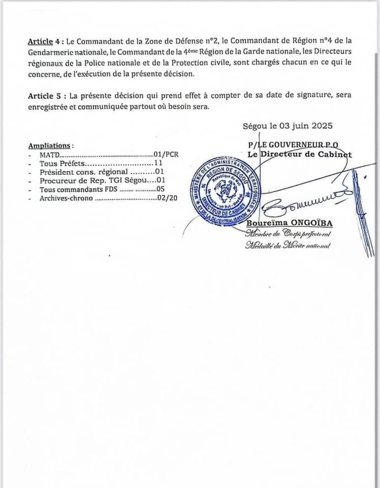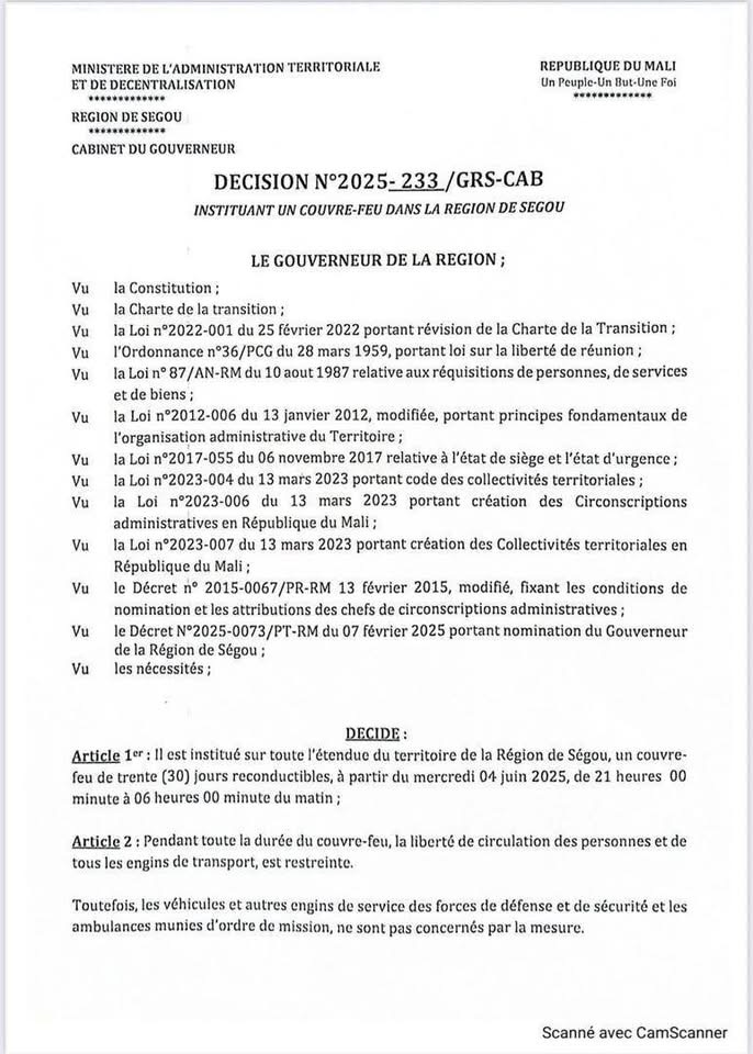 أعلن حاكم ولاية “سيغو” الواقعة في وسط مالي فرض حظر تجول لمدة شهر، يبدأ من مساء يوم الأربعاء عند الساعة التاسعة ليلاً بالتوقيت المحلي، ويستمر يوميًا حتى السادسة صباحًا.