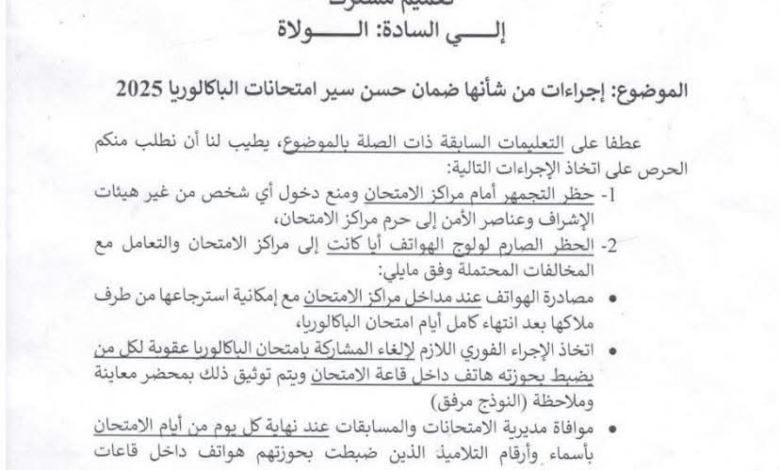 وجاء في التعميم منع التجمهر أمام مراكز الامتحانات، وحصر الدخول إلى محيطها على أعضاء هيئات الإشراف وعناصر الأمن فقط، وذلك بهدف ضمان الهدوء والانضباط خلال أيام الامتحان.