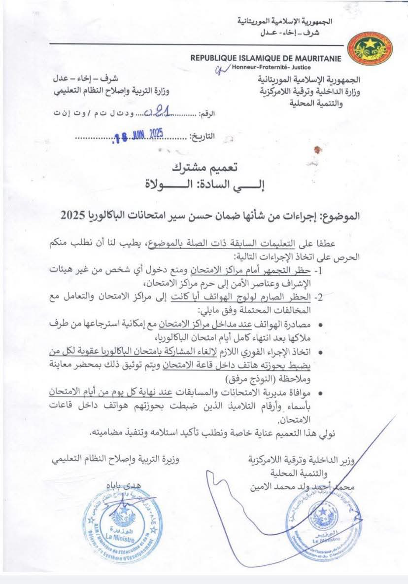 أصدرت وزارتا الداخلية والتربية وإصلاح النظام التعليمي في موريتانيا تعميمًا مشتركًا موجَّهًا إلى جميع الولاة، يتضمّن حزمة من الإجراءات التنظيمية الصارمة لتأمين سير امتحانات شهادة الباكالوريا لسنة 2025.