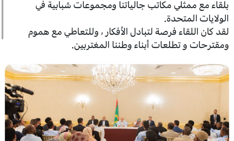 السلطة الموازية( واشنطن)- قال الرئيس محمد ولد الشيخ الغزواني إن اللقاء بممثلي مكاتب الجالية الموريتانية في الولايات المتحدة شكل فرصة للتعاطي مع هموم ومقترحات وتطلعات الجالية.
