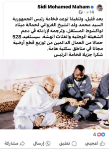 وأضاف أن هذه الخطوة تأتي تنفيذًا لتعهد سابق من رئيس الجمهورية محمد ولد الشيخ الغزواني لصالح عمال ميناء نواكشوط، و”ترجمة لإرادته في دعم الشغيلة الوطنية، لاسيما الفئات الهشة والمهمشة”.