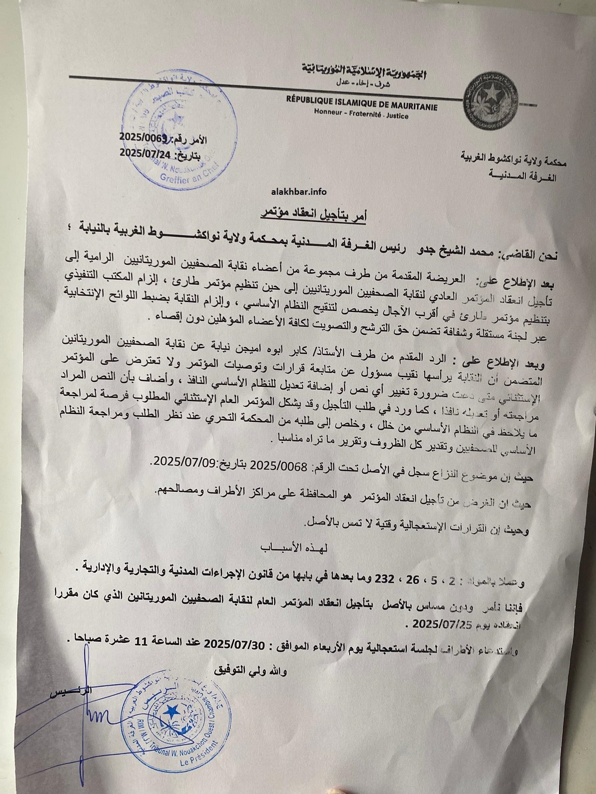 السلطة الموازية (نواكشوط) – أصدر رئيس الغرفة المدنية بمحكمة ولاية نواكشوط الغربية، بالنيابة، قرارًا بتعليق انعقاد المؤتمر العادي لنقابة الصحفيين الموريتانيين، الذي كان من المقرر تنظيمه نهاية الشهر الجاري.