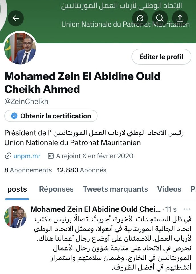 السلطة الموازية (نواكشوط) – أجرى رئيس الاتحاد الوطني لأرباب العمل الموريتانيين، السيد محمد زين العابدين ولد الشيخ أحمد، اتصالًا برئيس مكتب اتحاد الجالية الموريتانية في أنغولا، وممثل الاتحاد الوطني لأرباب العمل هناك، للاطلاع على أوضاع رجال الأعمال الموريتانيين في ظل المستجدات الأخيرة.