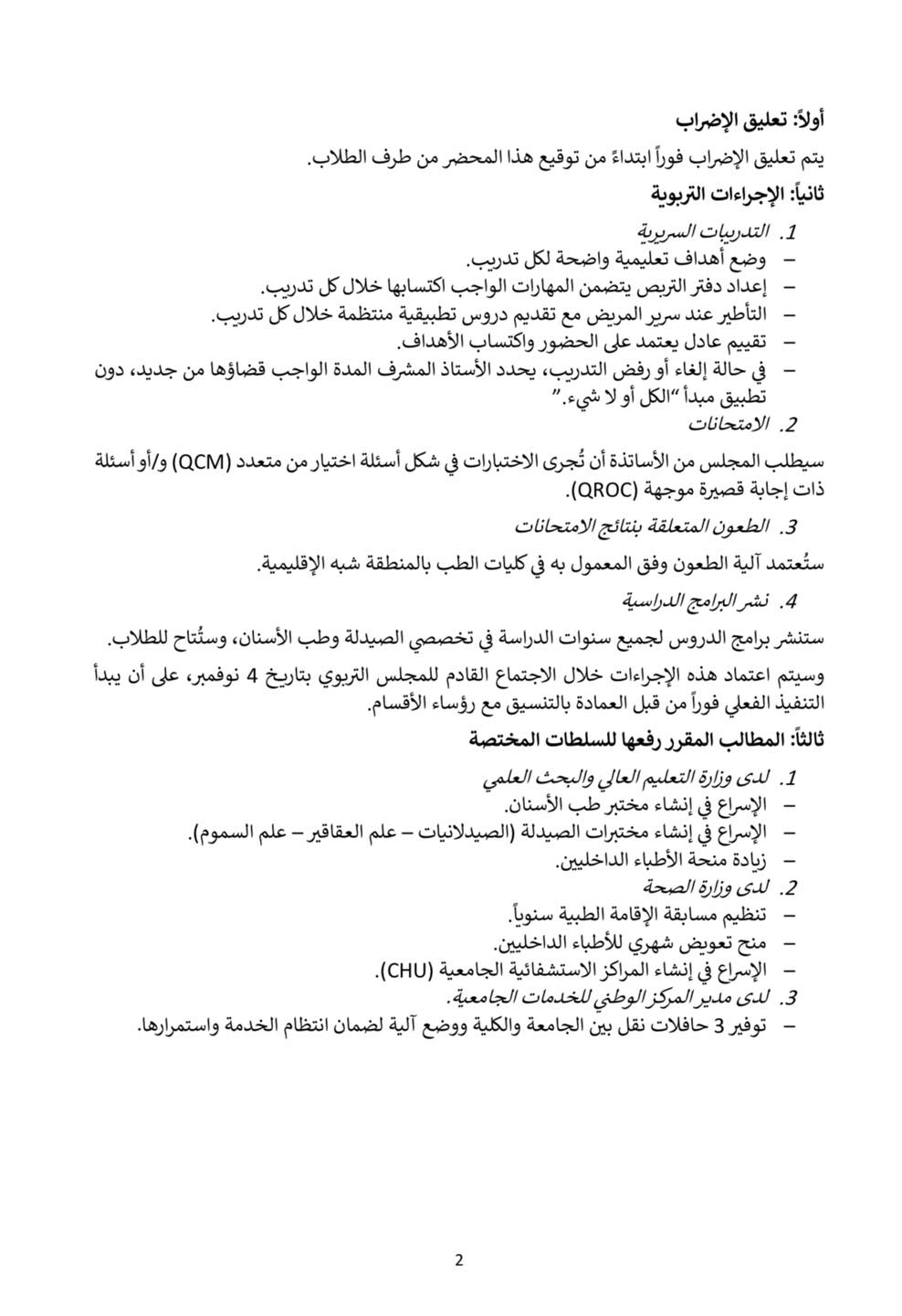 وينص الاتفاق على إصلاحات في التكوين والتقييم، تشمل تحديد أهداف واضحة للتدريب وإعداد دفتر تربص، والتأطير عند سرير المريض، واعتماد تقييم يعتمد على الحضور واكتساب المهارات بدل نظام “الكل أو لا شيء”. كما تم الاتفاق على تنظيم الامتحانات وفق معايير حديثة وآلية للطعن فيها.