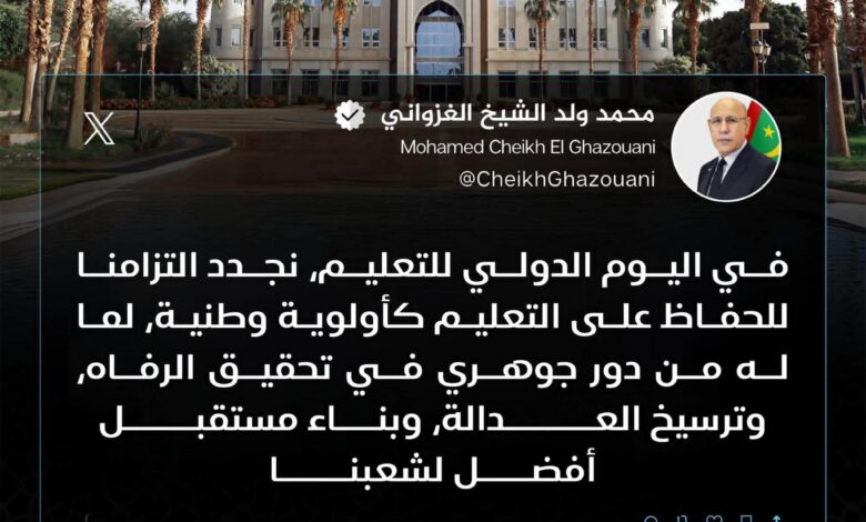 وأوضح الرئيس، في تغريدة نشرها على حسابه الرسمي بمنصة «إكس»، أن هذا الالتزام ينبع من الدور المحوري للتعليم في تحقيق الرفاه الاجتماعي، وترسيخ العدالة، وبناء مستقبل أفضل للشعب الموريتاني.