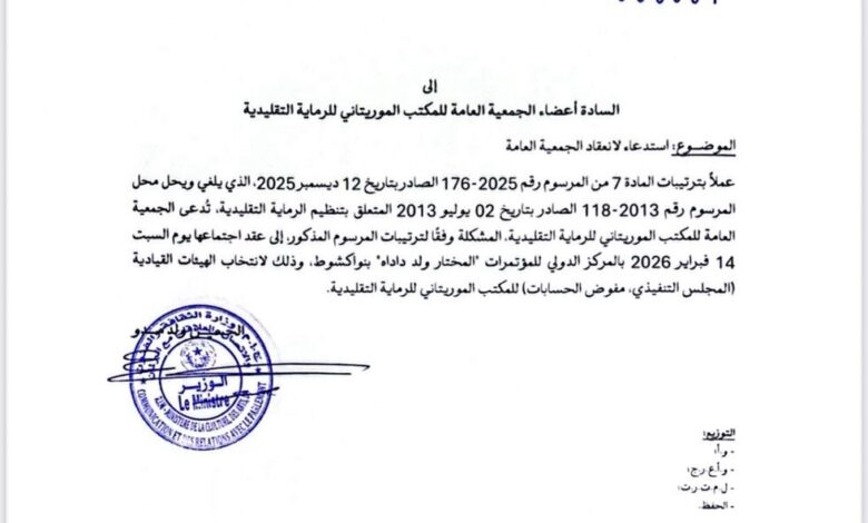 السلطة الموازية- وجّه وزير الثقافة والفنون والاتصال والعلاقات مع البرلمان دعوة رسمية إلى أعضاء الجمعية العامة للمكتب الموريتاني للرماية التقليدية، لعقد اجتماع الجمعية العامة يوم السبت 14 فبراير 2026، بالمركز الدولي للمؤتمرات “المختار ولد داداه” في نواكشوط.