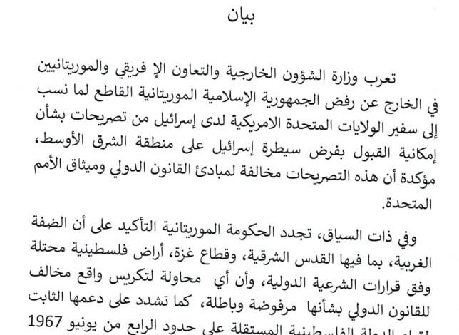 موريتانيا ترفض تصريحات منسوبة لسفير واشنطن في تل أبيب وتؤكد فلسطينية الأراضي المحتلة.