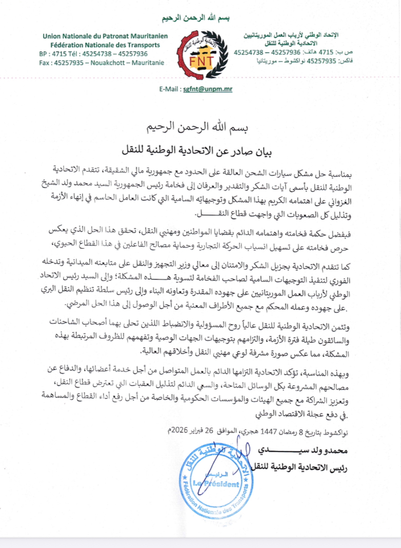 وصدر البيان في نواكشوط بتاريخ 26 فبراير 2026.