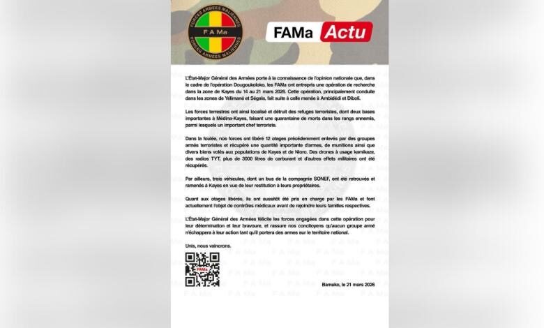 وأوضحت الهيئة، في بيان صادر عنها، أن القوات البرية المالية تمكنت في إطار عملية “دوغوكولوكو”، التي تعني “عملية من أجل الأرض”، من تحرير 12 رهينة كانوا قد اختطفوا سابقًا على يد جماعات مسلحة، إضافة إلى استرجاع كميات كبيرة من الأسلحة والذخيرة، وممتلكات مختلفة سُرقت من سكان مدينتي خاي ونيورو.