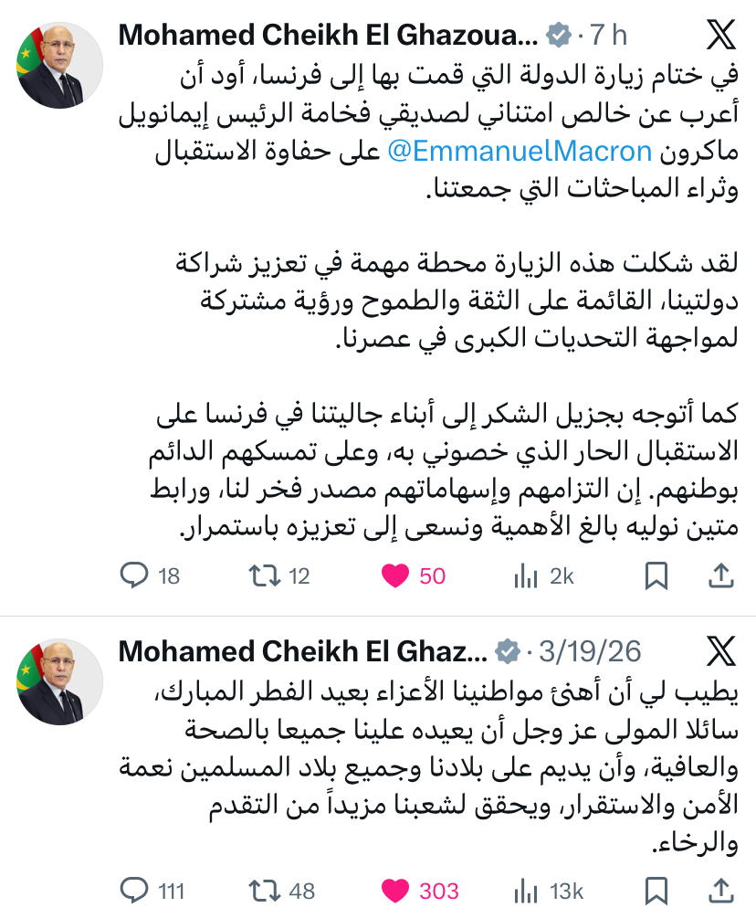 السلطة الموازية – أعرب رئيس الجمهورية محمد ولد الشيخ الغزواني عن امتنانه للرئيس الفرنسي إيمانويل ماكرون، عقب اختتام زيارة الدولة التي أداها إلى فرنسا، مشيداً بحفاوة الاستقبال وثراء المباحثات التي جمعتهما.