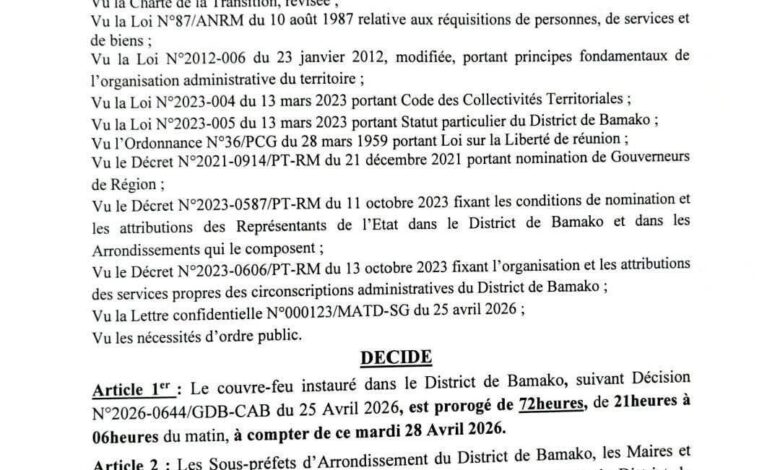 السلطة الموازية – أعلنت السلطات في باماكو، عاصمة مالي، عن تمديد حظر التجول لمدة 72 ساعة إضافية، وذلك ابتداءً من مساء الثلاثاء 28 أبريل 2026.