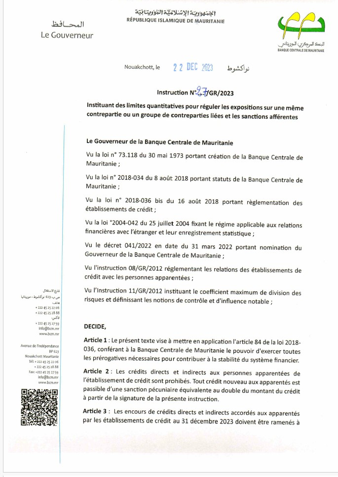 السلطة الموازية – حظر البنك المركزي الموريتاني على البنوك الخاصة تقديم أي قروض مباشرة أو غير مباشرة للشركات المقربة أو التي يملكها مساهمون أو ما يعرف بـ PERSOUNNES APPARENTE.