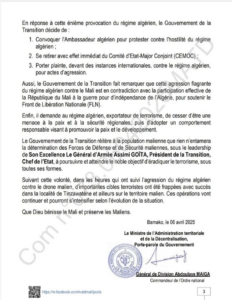 أعلنت السلطات المالية تقدمها بشكوى أمام الهيئات الدولية “ضد النظام الجزائري لارتكابه أعمالا عدوانية”، تمثلت في إسقاط الجزائر قبل أيام طائرة مسيرة تابعة للجيش المالي.