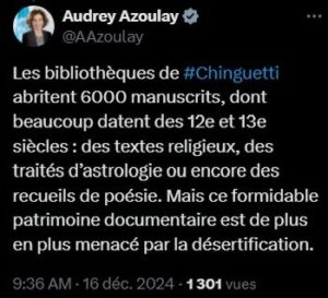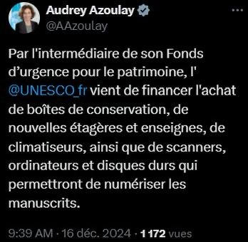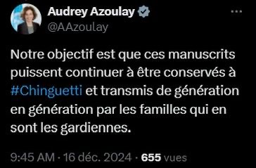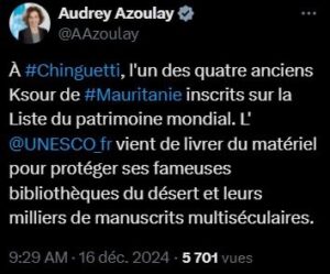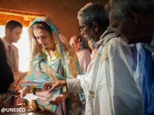 كما سلطت المديرة العامة الضوء على دعم اليونسكو، عبر صندوق الطوارئ للتراث، للمكتبات التاريخية في مدينة شنقيط من خلال توفير العديد من الأجهزة والمعدات بهدف رقمنة المخطوطات وضمان الحفاظ عليها.