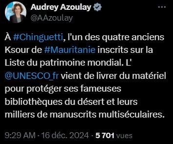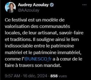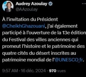 السلطة الموازية- أشادت المديرة العامة لمنظمة الأمم المتحدة للتربية والعلم والثقافة (اليونسكو) أودري أزولاي، عبر سلسلة من التغريدات، على صفحتها على منصة إكس، وعلى موقع اليونسكو، بمهرجان مدائن التراث الذي حضرت نسخته الثالثة عشر بدعوة من رئيس الجمهورية السيد محمد ولد الشيخ الغزواني مؤكدة أن المهرجان يمثل نموذجًا في إبراز التراث الثقافي والتاريخي الغني للمدن الصحراوية الأربع المدرجة ضمن قائمة التراث العالمي.